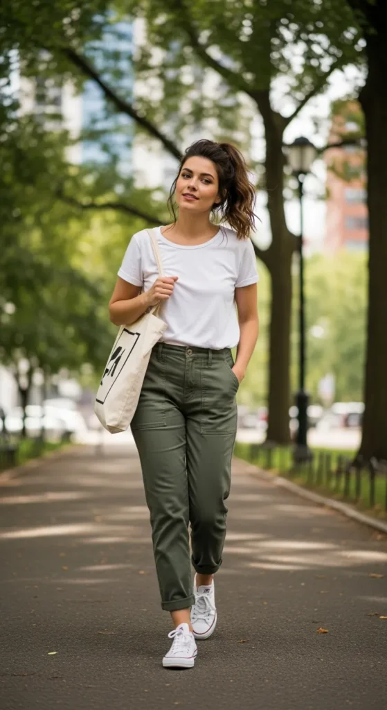 A crisp white t-shirt paired with relaxed utility pants feels effortless yet intentional. Sneakers enhance the casual vibe while keeping the look functional and cool for everyday spring movement.
