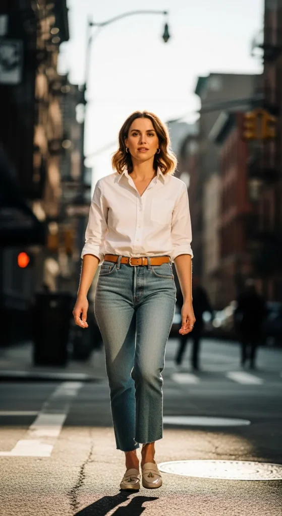 A breezy cotton shirt tucked into relaxed straight jeans feels effortlessly fresh for spring days, balancing comfort and polish while moving easily from coffee runs to casual meetings without feeling overdressed anywhere.