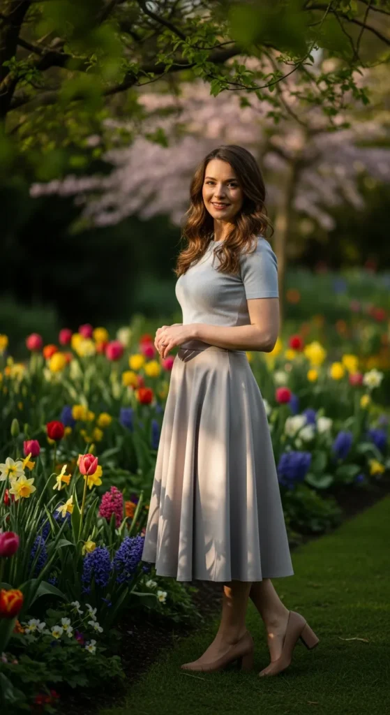 A flowing midi skirt styled with a simple fitted top feels romantic yet practical for spring, offering movement, comfort, and versatility for everything from casual dates to daytime events.