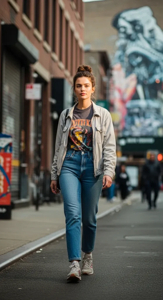 Layering a graphic tee under a light jacket brings personality to spring outfits, making casual looks feel expressive, fun, and reflective of personal style without trying too hard.