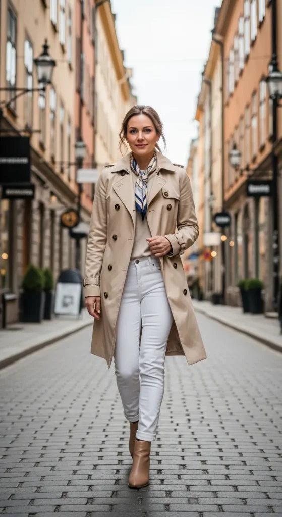 A classic beige trench coat over white jeans radiates timeless Scandinavian elegance, perfect for transitional spring or fall days.