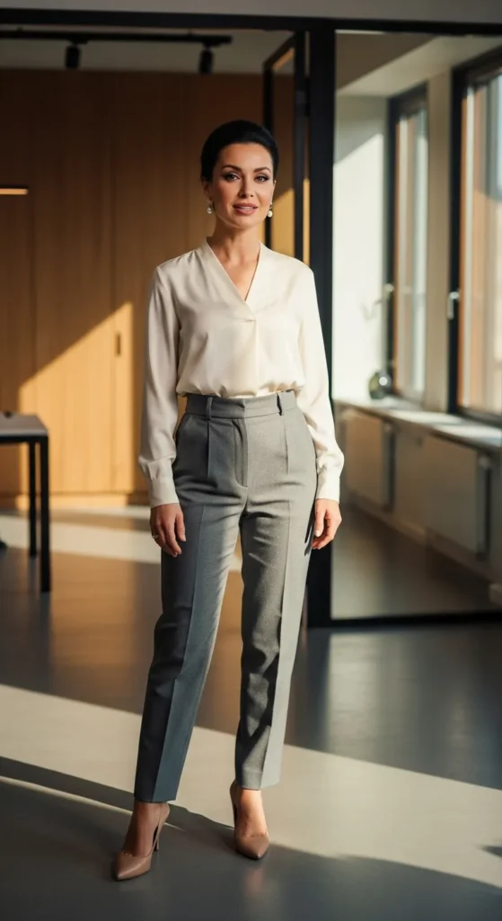 A cream silk blouse paired with gray tailored trousers embodies minimalistic elegance, perfect for professional meetings or refined brunches.