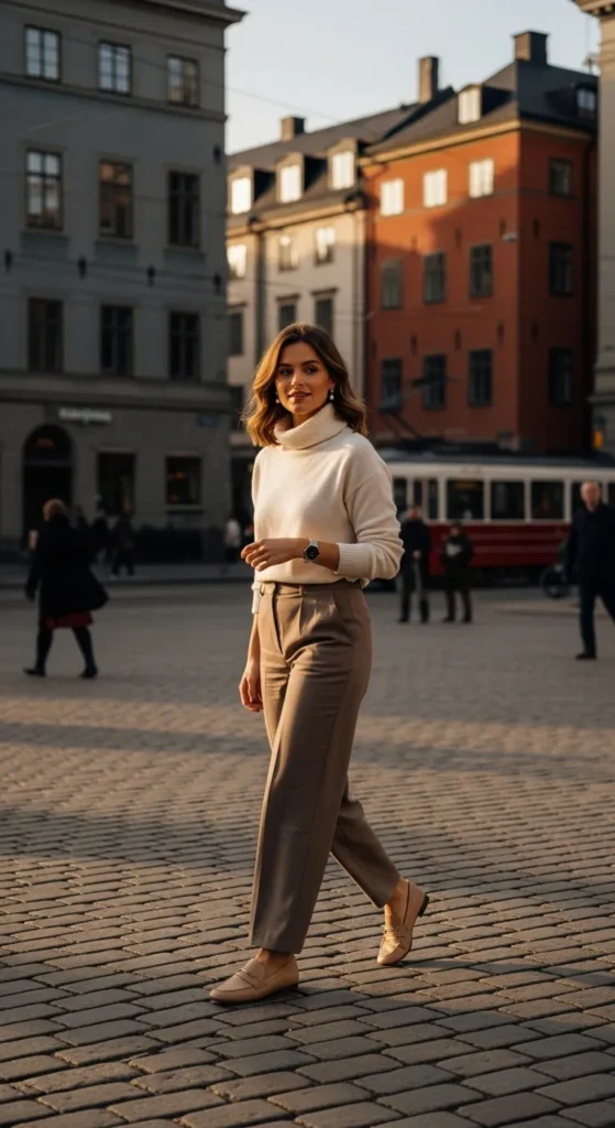 A cream turtleneck tucked into taupe wide-leg pants creates a refined silhouette. The combination balances comfort and elegance for café visits or gallery afternoons.