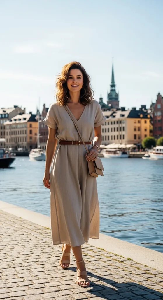 A flowy linen beige dress cinched with a slim leather belt creates casual sophistication. Perfect for summer days or riverside cafés.