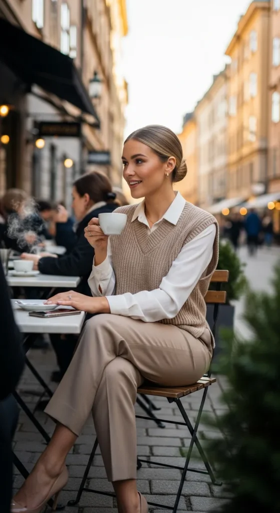 A neutral beige knit vest layered over a crisp white shirt creates subtle depth and texture for work or casual outings.