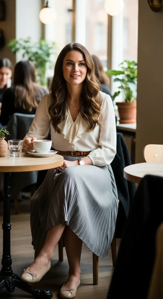 An off-white blouse tucked into a gray pleated skirt creates a soft, feminine silhouette ideal for museum visits or brunches.