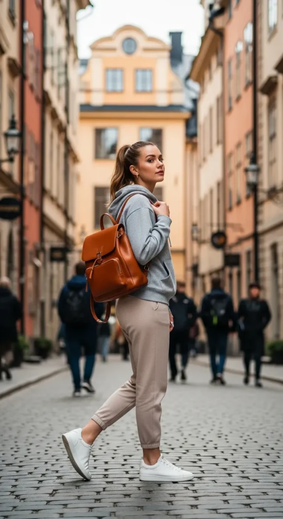 A soft gray hoodie matched with neutral joggers brings sporty-chic comfort to everyday city life. Perfect for coffee runs or weekend explorations.