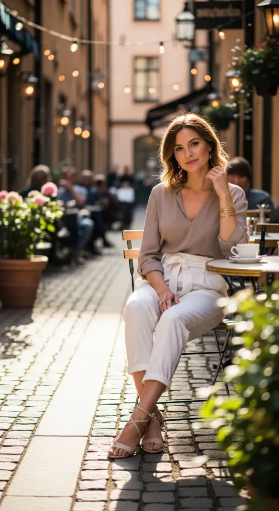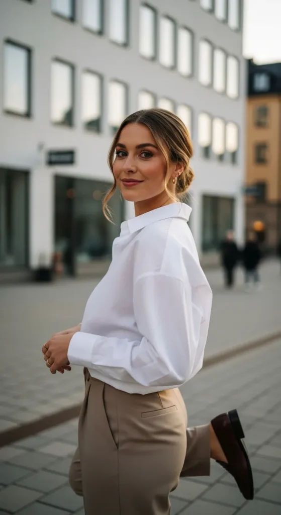 A crisp white button-down tucked into soft sand-colored trousers radiates polished Scandinavian elegance, ideal for gallery visits or brunches.