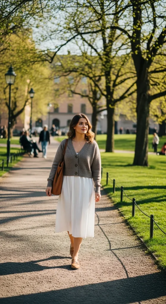 A taupe cardigan over a lightweight white cotton dress offers an airy, effortless vibe perfect for spring walks in Stockholm.