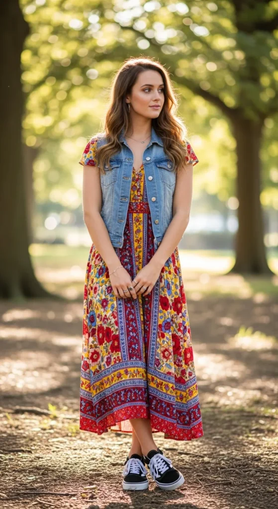 A lightweight boho-style dress layered with a denim vest pairs wonderfully with Vans for a laid-back festival or weekend stroll vibe. The combination is playful, whimsical, and effortlessly wearable.