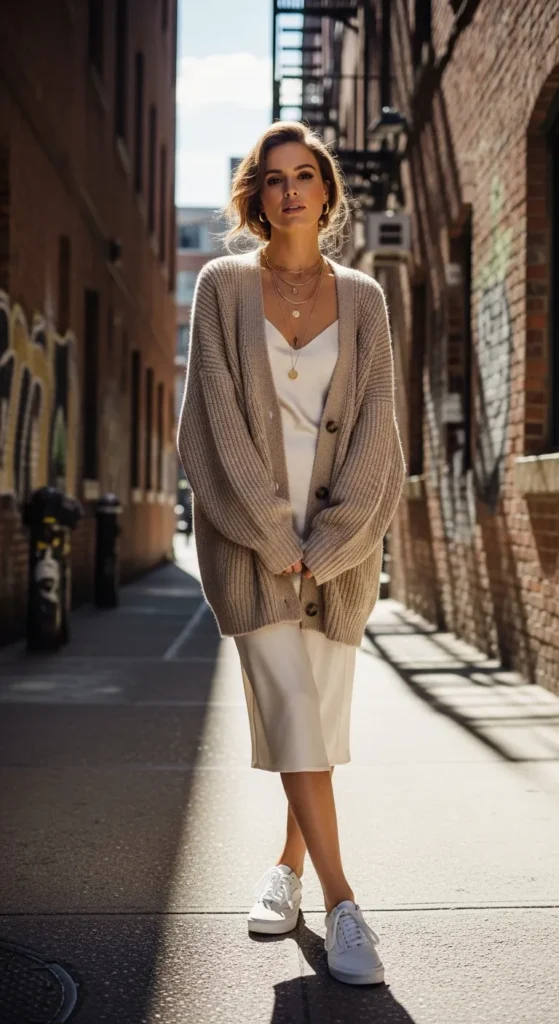 A soft oversized cardigan over a silky slip dress creates effortless cozy-chic vibes. Vans bring the outfit down-to-earth, perfect for casual dates or relaxed city outings.