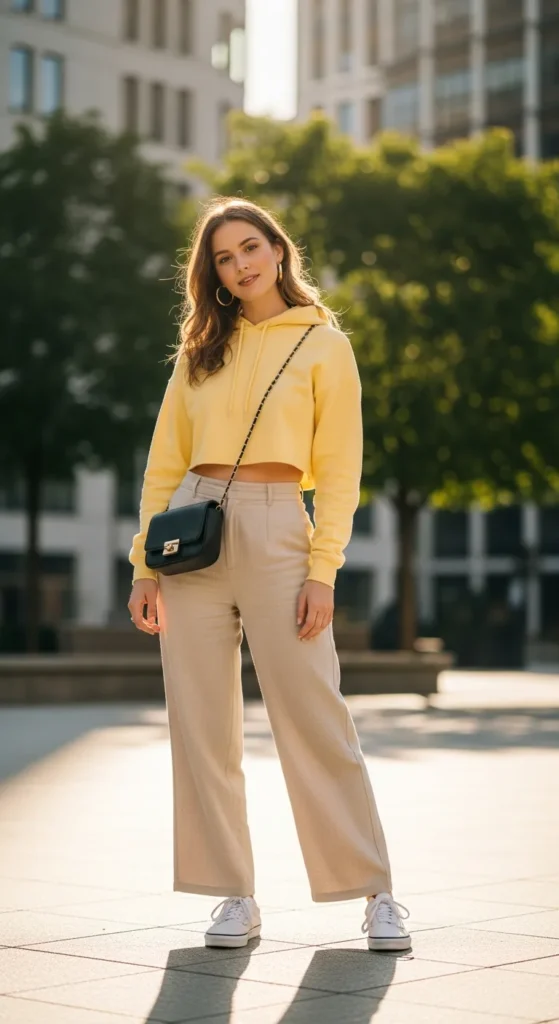 A crop hoodie paired with airy wide-leg linen pants blends casual comfort with chic, modern silhouette. Vans keep it grounded and stylish, perfect for city strolls or weekend farmers’ markets.