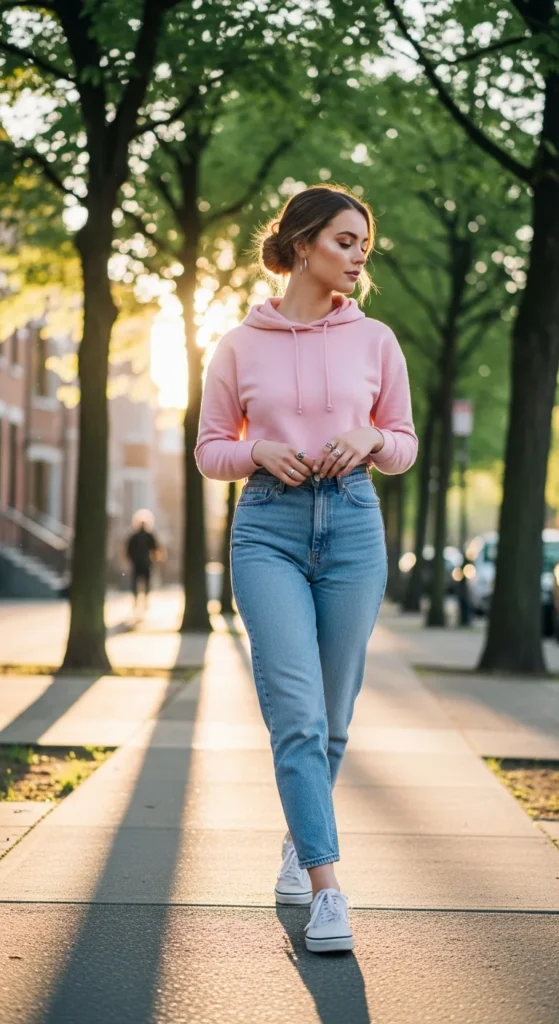 A cozy cropped hoodie balances with high-waisted mom jeans for a relaxed, playful energy. White Vans keep the outfit light and fresh, ideal for coffee runs or casual campus days.