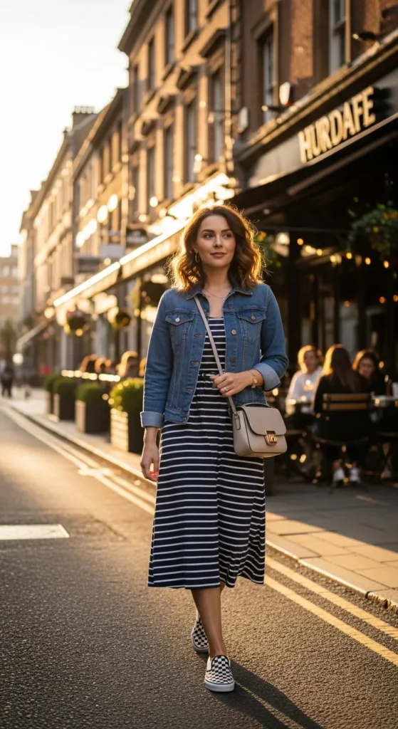 A playful striped midi dress gains an edge when paired with a denim jacket and checkerboard Vans. It’s feminine yet effortlessly cool, perfect for weekend brunches or casual art walks.