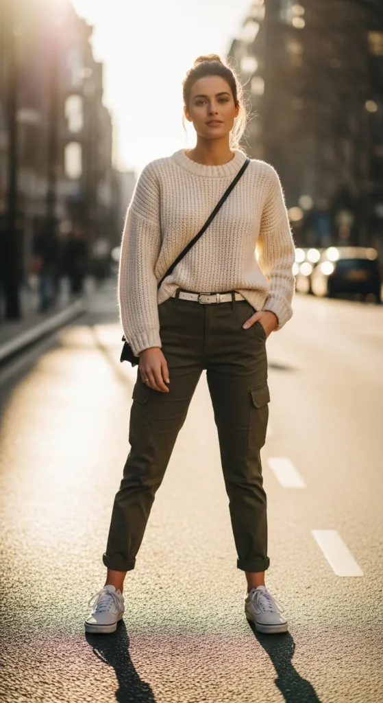 A chunky knit sweater paired with cargo pants balances softness and structure. Vans add playful practicality, perfect for casual office days or outdoor meetups.