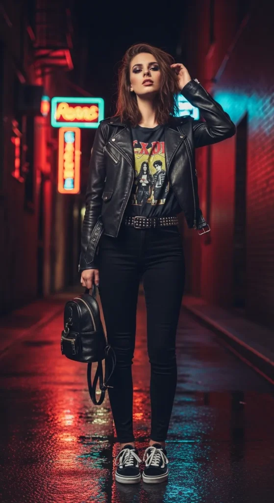 A black leather biker jacket over a vintage band tee with black skinny jeans radiates edgy rock-chic. Vans finish the look with classic street-ready style, ideal for concerts or evening meetups.