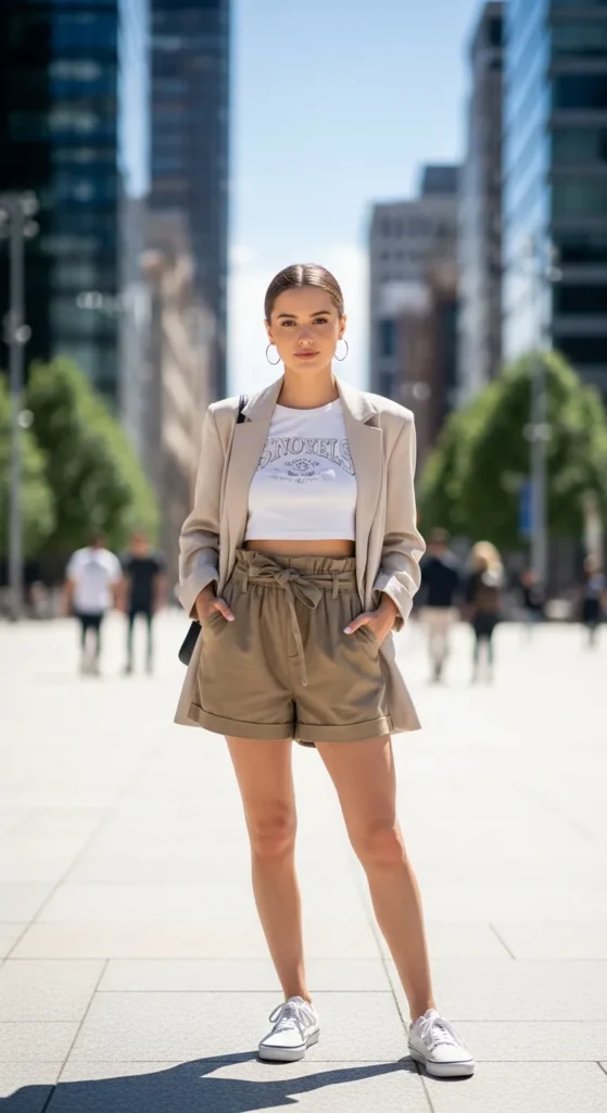 5. Oversized Blazer + Graphic Crop Top + Paperbag Waist Shorts + Vans
