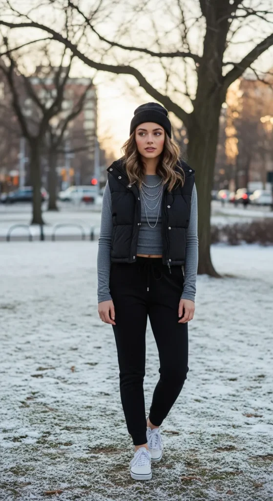 A cropped puffer vest layered over a fitted long-sleeve top with slim joggers balances comfort and style. Vans finish the casual chic ensemble for weekend walks or casual brunches.