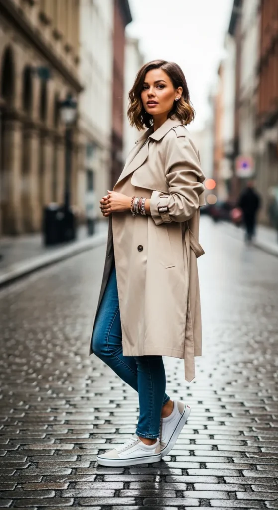 A classic trench coat layered over skinny jeans and Vans merges timeless elegance with street-smart comfort. Perfect for chilly afternoons or casual business-casual days with an approachable flair.