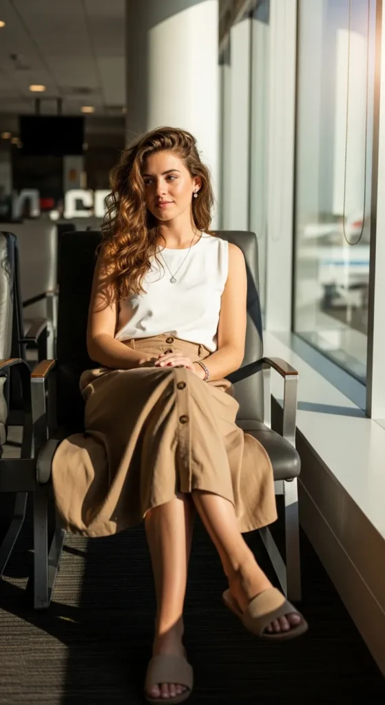 A button-front midi skirt paired with a fitted sleeveless top offers a classic yet breezy summer travel outfit. It’s comfortable for sitting yet stylish for airport photos.