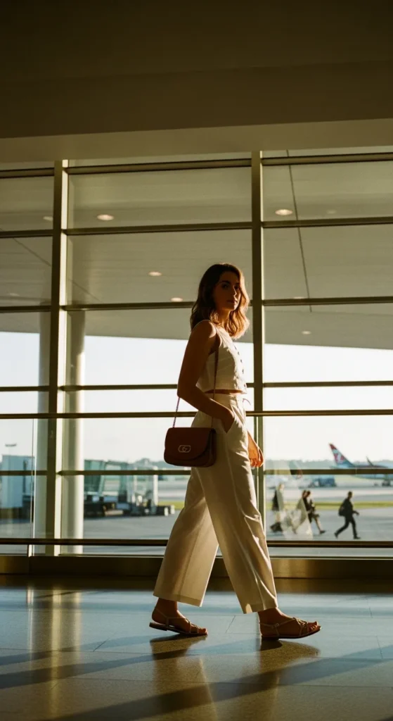 A breathable white cropped top with flowy, high-waist palazzo pants creates an elevated airport outfit. The wide-leg pants offer comfort while the cropped top adds a modern, stylish edge.