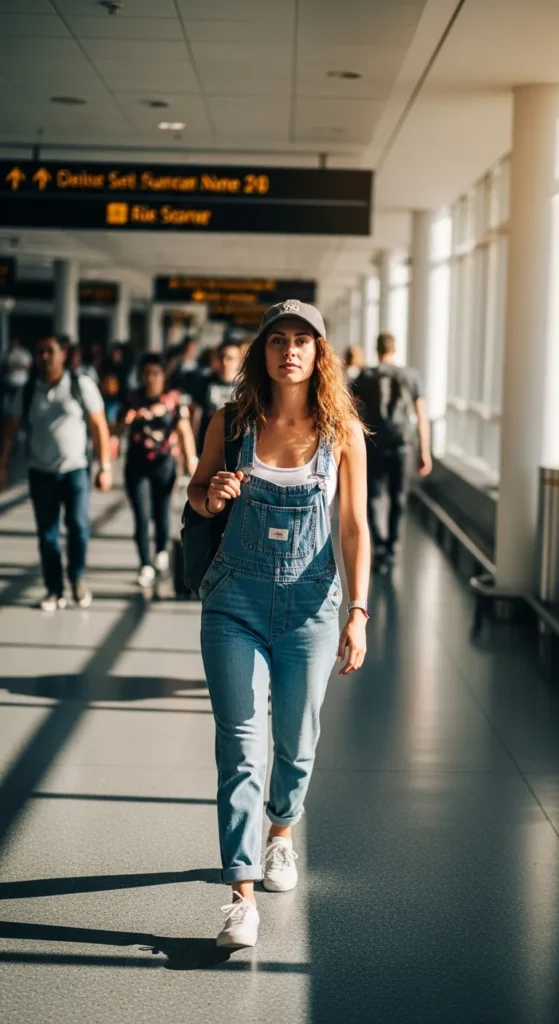Classic denim overalls over a fitted tank top offer a youthful, relaxed airport look. They are playful, practical, and easy to move in during summer travel.