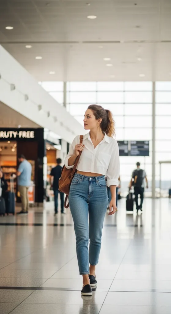 High-waist light-wash jeans with a cropped button-up shirt balances casual and polished style. Perfect for warm-weather flights that need effortless chic.
