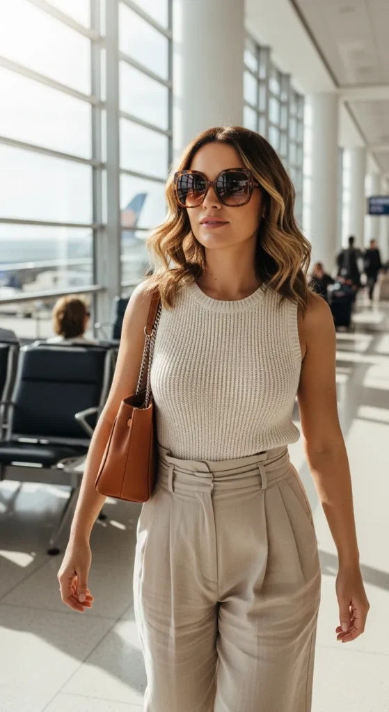 A fitted knit tank paired with wide-leg linen pants keeps your silhouette chic while staying airy. Ideal for warm summer flights and stylish arrivals.
