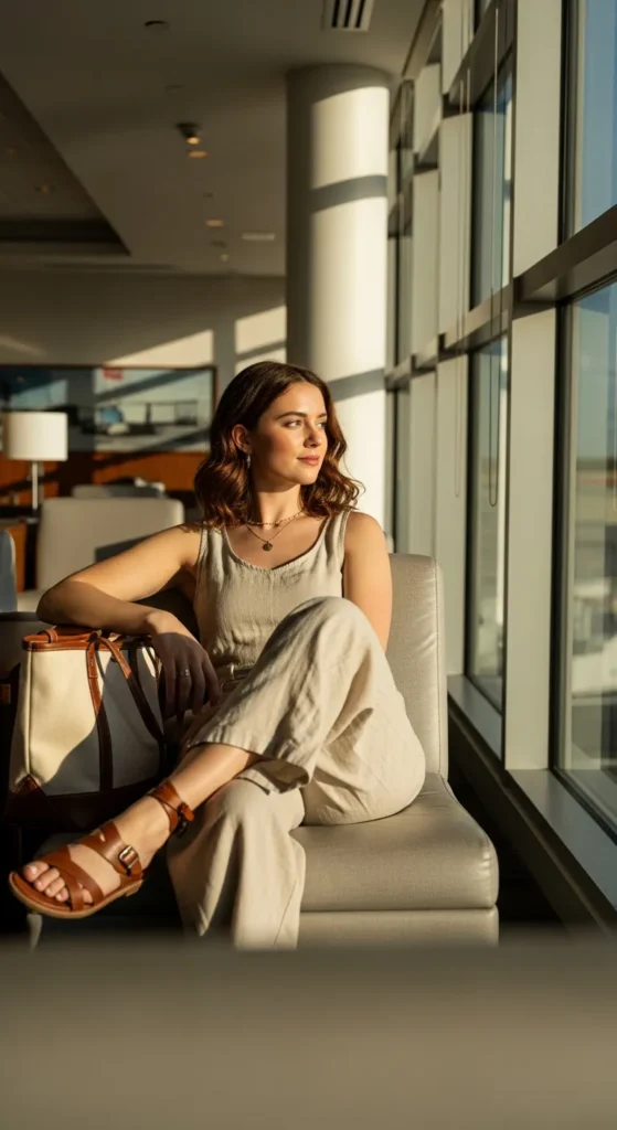 A lightweight linen jumpsuit in soft beige paired with strappy leather sandals is the ultimate breezy summer travel outfit. It flows with movement yet looks polished, perfect for both airports and city strolls.