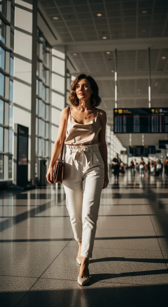 A silk camisole paired with soft paperbag waist pants offers refined elegance with maximum comfort. Perfect for summer flights that require chic layering.