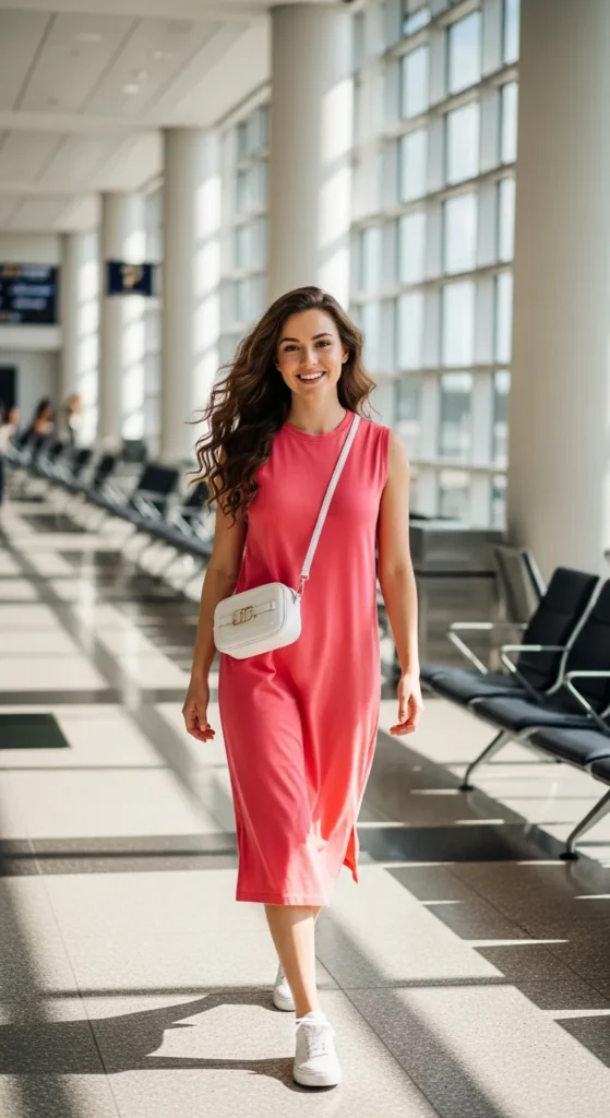 A sleeveless midi dress in a solid summer hue, paired with white sneakers, balances comfort and style. Perfect for long flights and quick airport walks while staying effortlessly chic.