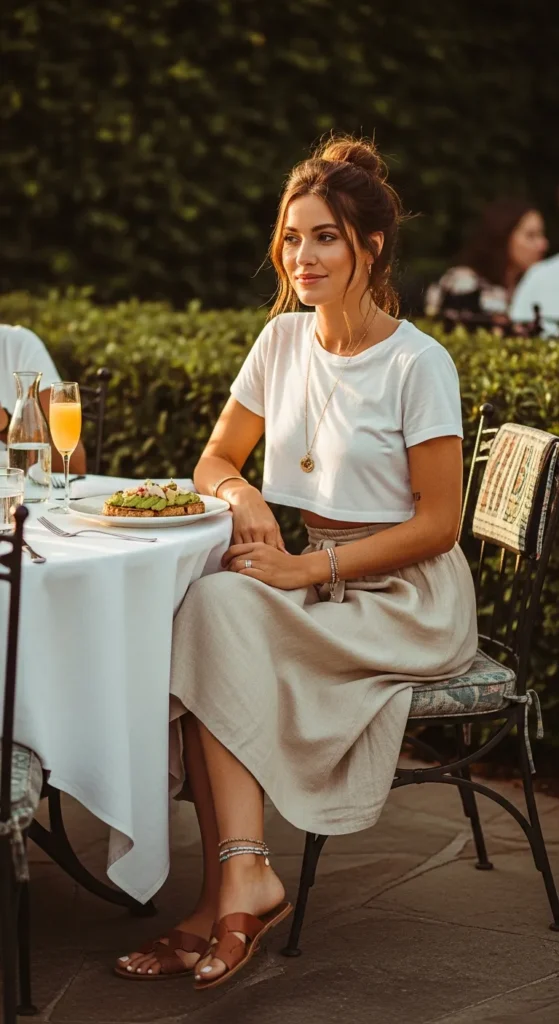 A simple cropped tee with a linen midi skirt feels relaxed yet stylish for summer brunch mornings. The breathable fabrics keep you comfortable while the silhouette remains modern and flattering.