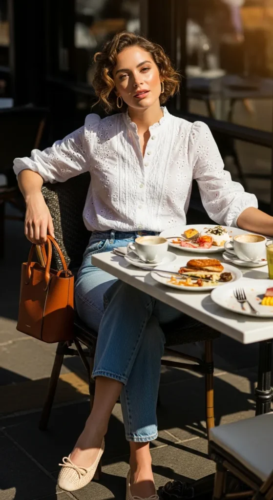 An eyelet blouse paired with relaxed jeans creates a charming contrast of delicate and casual. The textured fabric instantly brightens the outfit while the denim keeps it grounded and comfortable.
