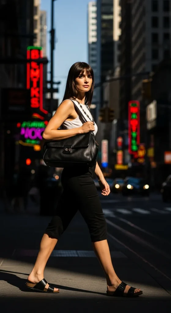 Black capri pants with a fitted white top create a timeless contrast that feels sleek and versatile for both casual and slightly dressed-up summer moments.