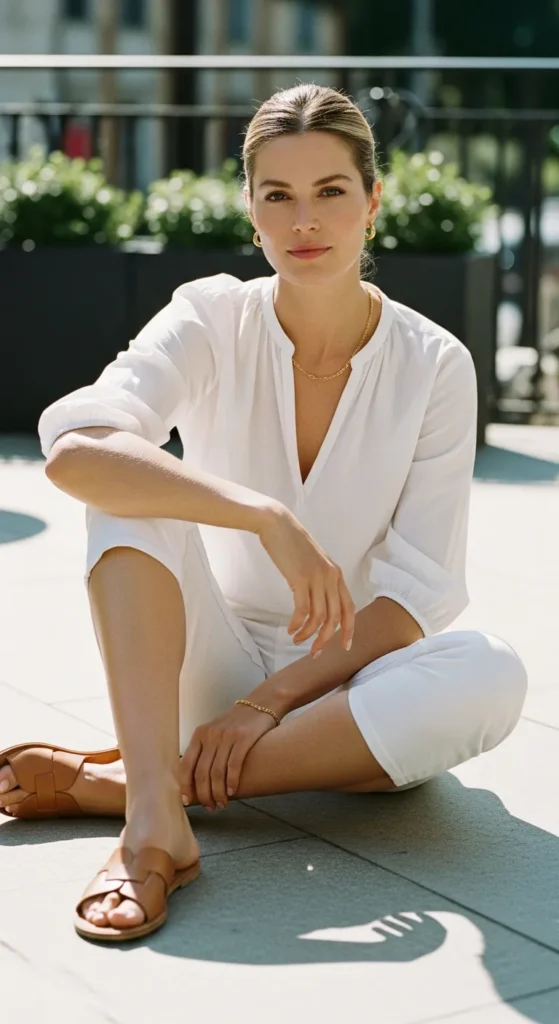 All-white capri pants and a breezy cotton blouse bring a clean, polished summer aesthetic that feels fresh and quietly confident, perfect for daytime events or casual chic moments.