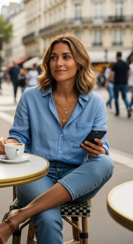 Light denim capri pants styled with a breezy linen shirt create a balanced mix of structure and softness, perfect for effortless daytime outings.