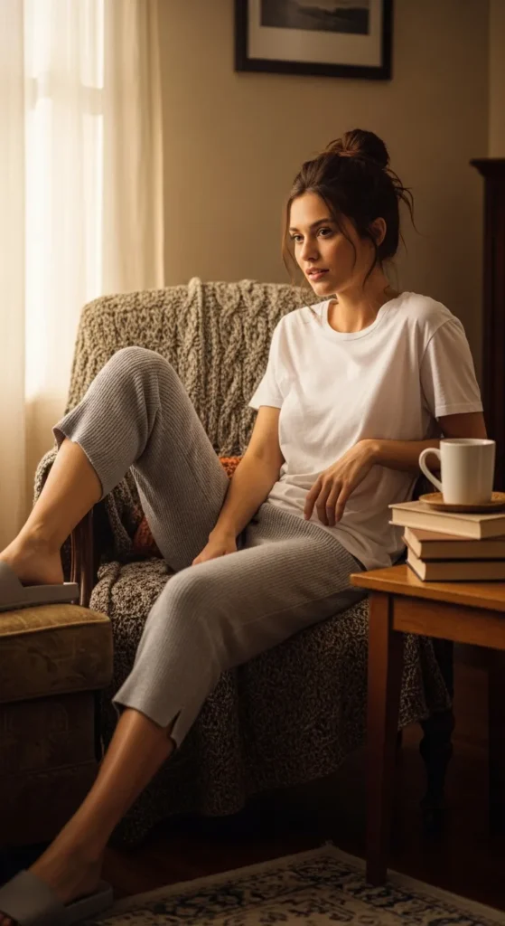 Stretchy knit capri pants with a loose oversized tee create a cozy yet breathable outfit that’s perfect for lounging at home or stepping out for quick errands.