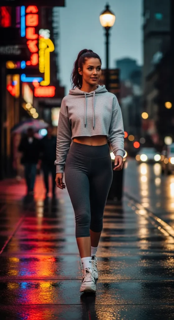 Capri leggings paired with a cropped hoodie create a sporty, on-the-go outfit that’s perfect for active days or casual streetwear looks.
