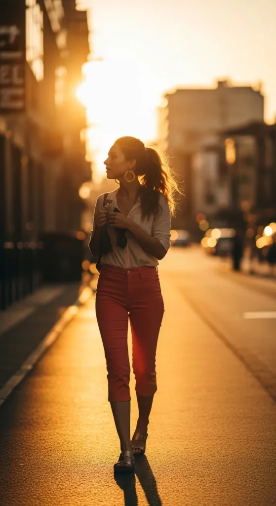 Coral capri pants paired with a simple cream tee bring warmth and vibrance to your outfit without feeling overwhelming, making it perfect for sunset walks or evening casual outings.