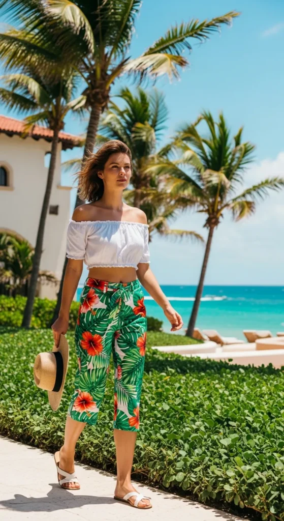 Printed capri pants with tropical patterns paired with a simple white crop top create a lively, vacation-ready look that instantly lifts your mood on hot summer days.