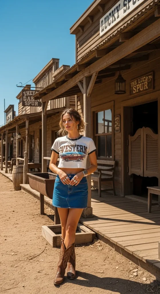 A vintage-style western graphic tee tucked into a denim mini skirt creates a youthful cowgirl outfit that feels fun and relaxed. It’s the perfect combination of casual summer style with a hint of western personality.