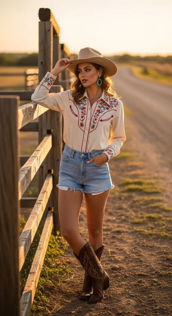 Classic denim shorts paired with a lightweight embroidered western shirt create an effortless summer cowgirl vibe. The embroidery adds personality while the relaxed fit keeps things breezy, making it perfect for sunny afternoons and casual country outings.
