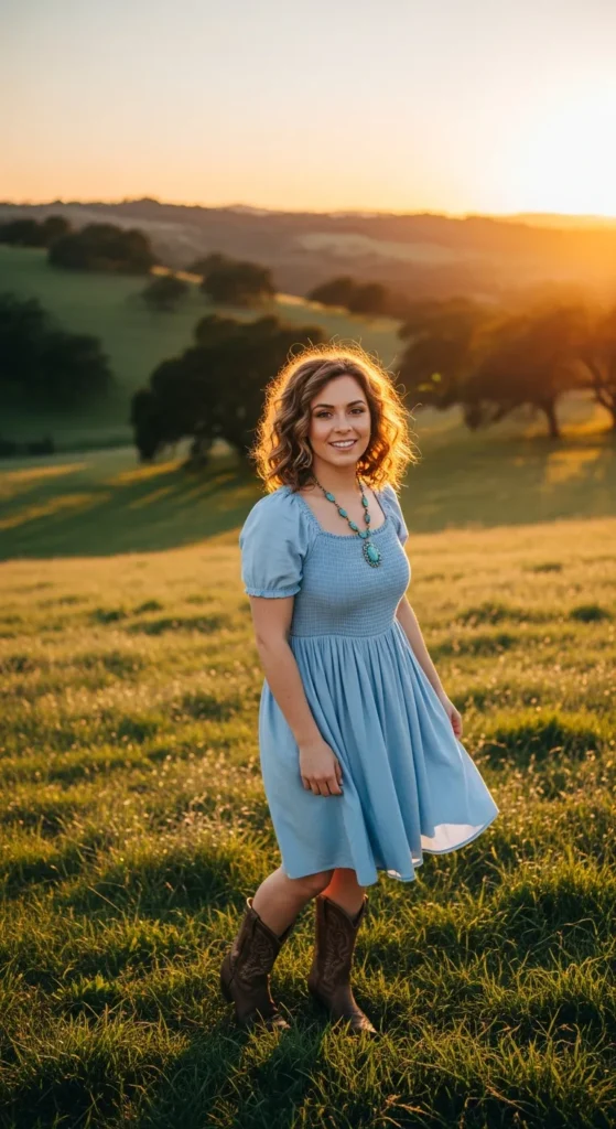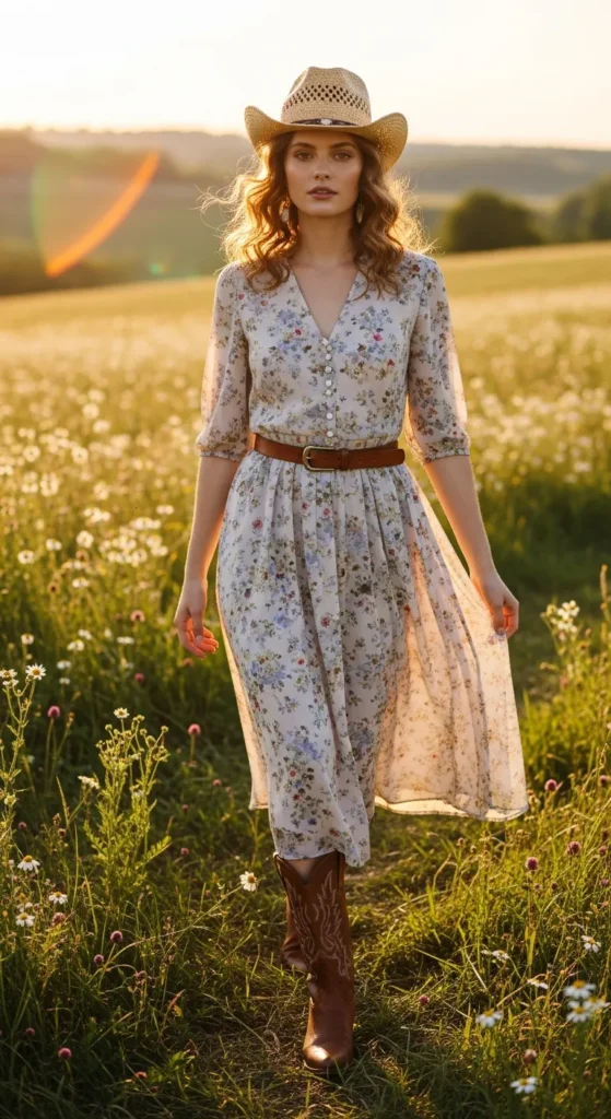 A soft floral summer dress instantly feels sweeter when styled with rugged cowgirl boots. The contrast between romantic fabric and western footwear creates a charming balance that feels playful, feminine, and perfect for warm countryside days.
