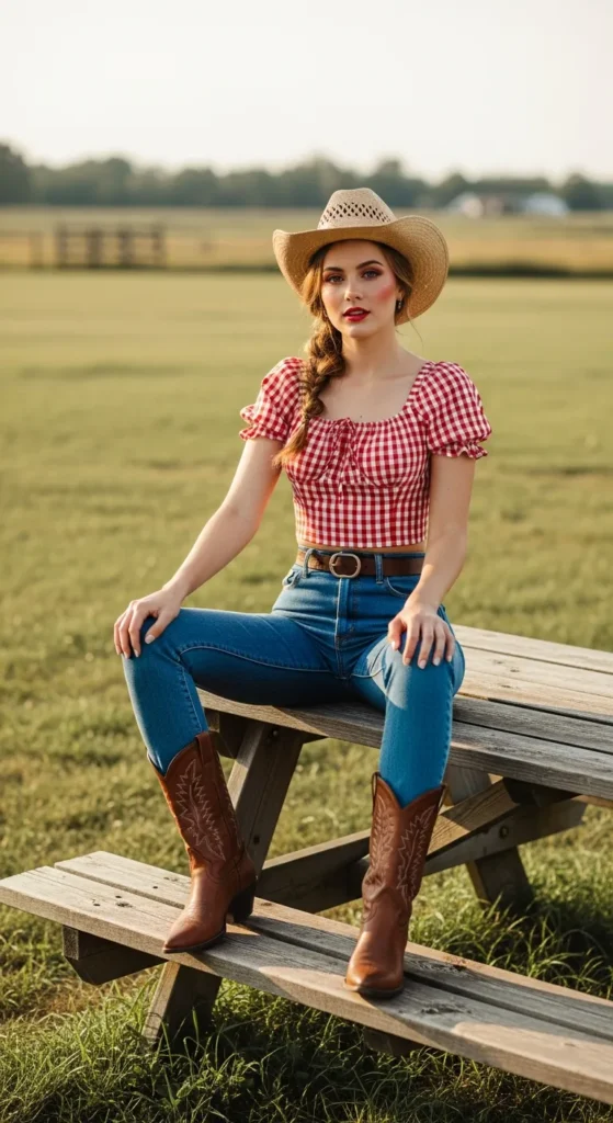 A gingham crop top styled with high-waisted straight leg jeans gives a sweet western picnic vibe. The pattern feels playful while the denim keeps it grounded, creating an outfit that’s comfortable yet full of cowgirl personality.