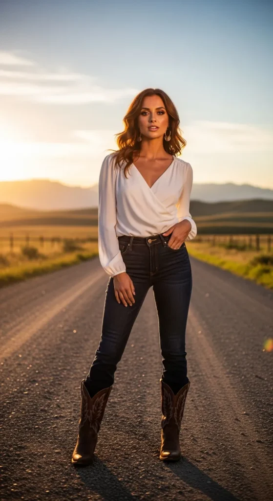 Stylist Suggestion: Choose statement cowgirl boots with subtle stitching patterns. Since the top is simple and feminine, detailed boots add visual interest and pull attention downward beautifully.
