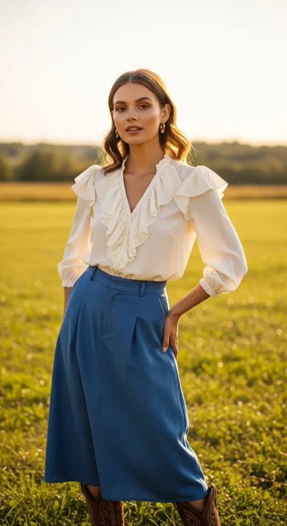 A ruffle sleeve summer top paired with a classic denim skirt creates a sweet cowgirl outfit that feels both romantic and rustic. The ruffles soften the look while the denim keeps it grounded.
