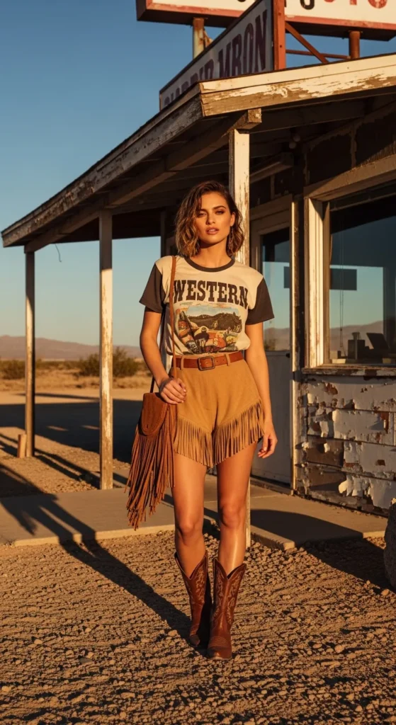 A bold western graphic tee paired with fringe shorts creates a fun and slightly edgy cowgirl outfit. The fringe adds movement while the tee keeps the look relaxed and youthful.