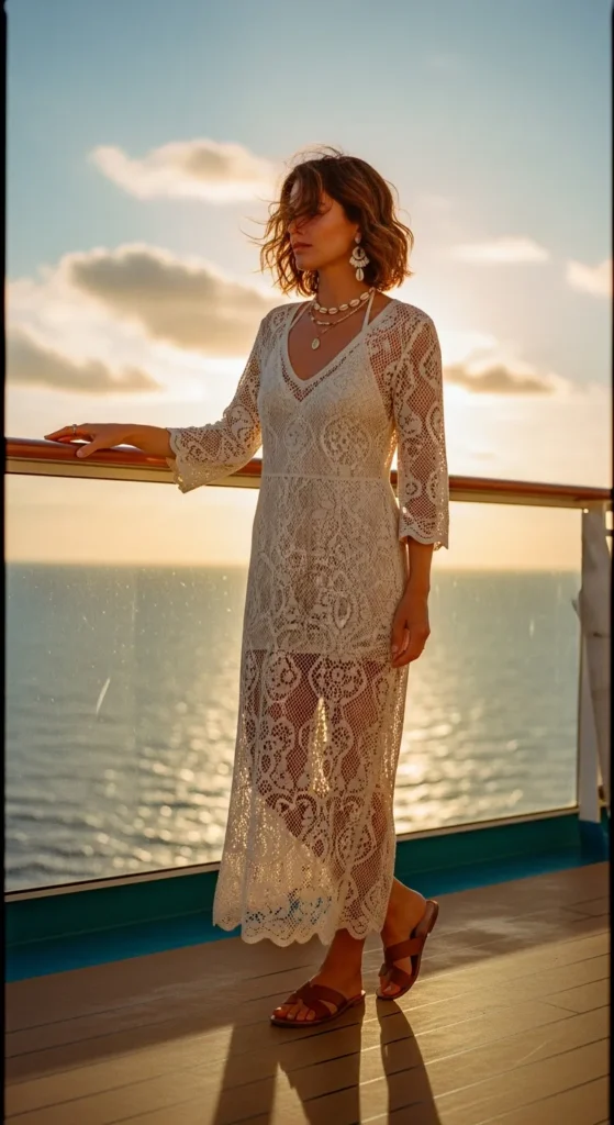 A lightweight crochet maxi dress offers a boho-inspired cruise vibe. The breathable knit pattern keeps things airy, while the flowing silhouette adds a dreamy, relaxed elegance perfect for walking along the ship’s deck.