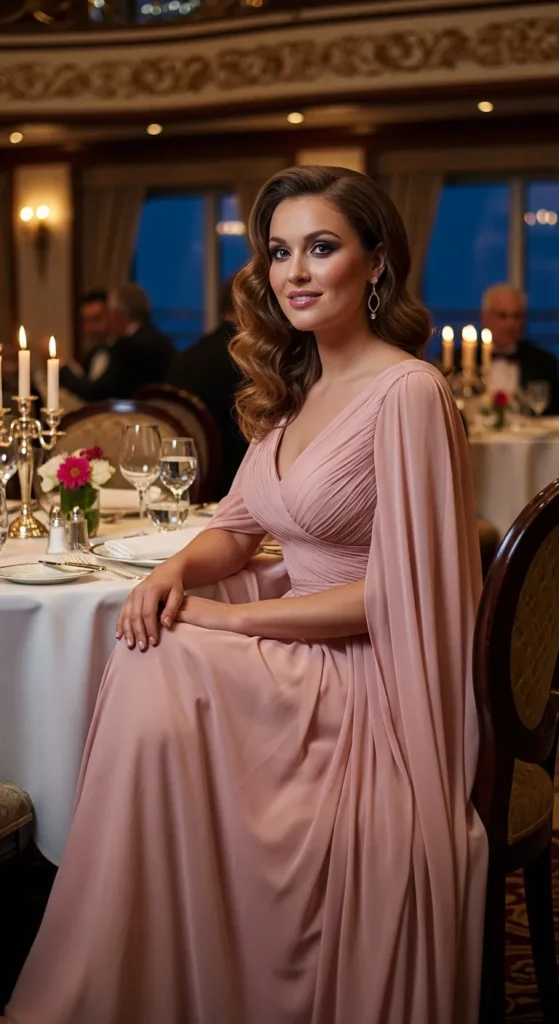 A flowing chiffon gown in soft blush or lavender brings dreamy elegance for formal cruise dinners. The lightweight fabric moves gracefully with every step under evening lights.