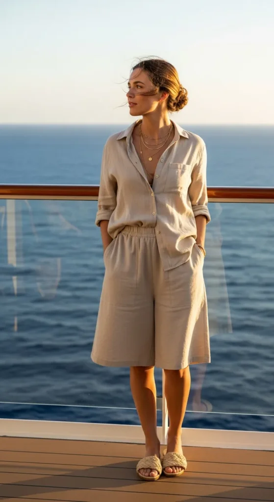 A relaxed linen button-down paired with matching wide-leg shorts creates an airy and polished cruise look. The soft fabric moves easily with ocean winds, while neutral tones keep it effortlessly chic for daytime exploring or casual deck lounging.